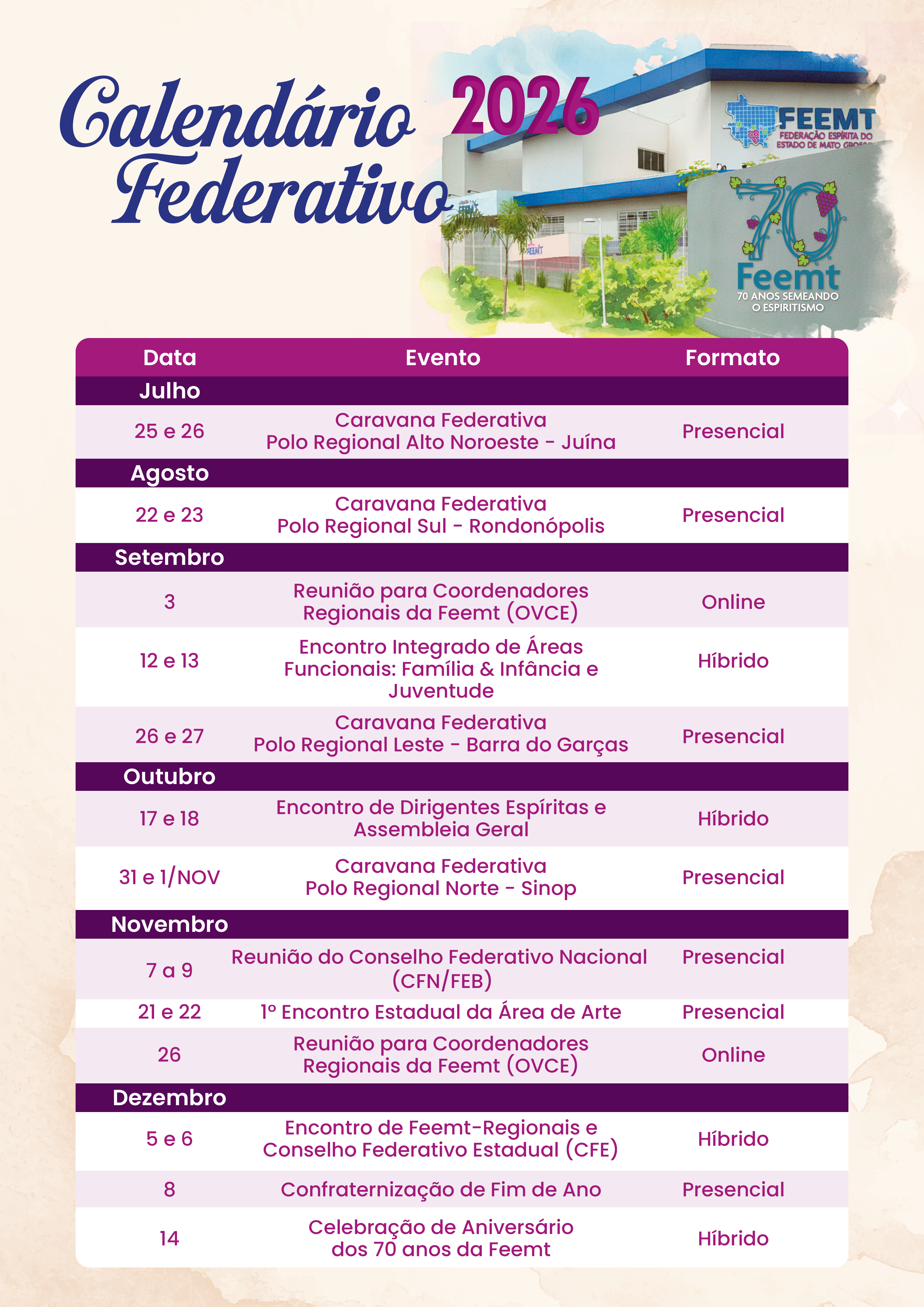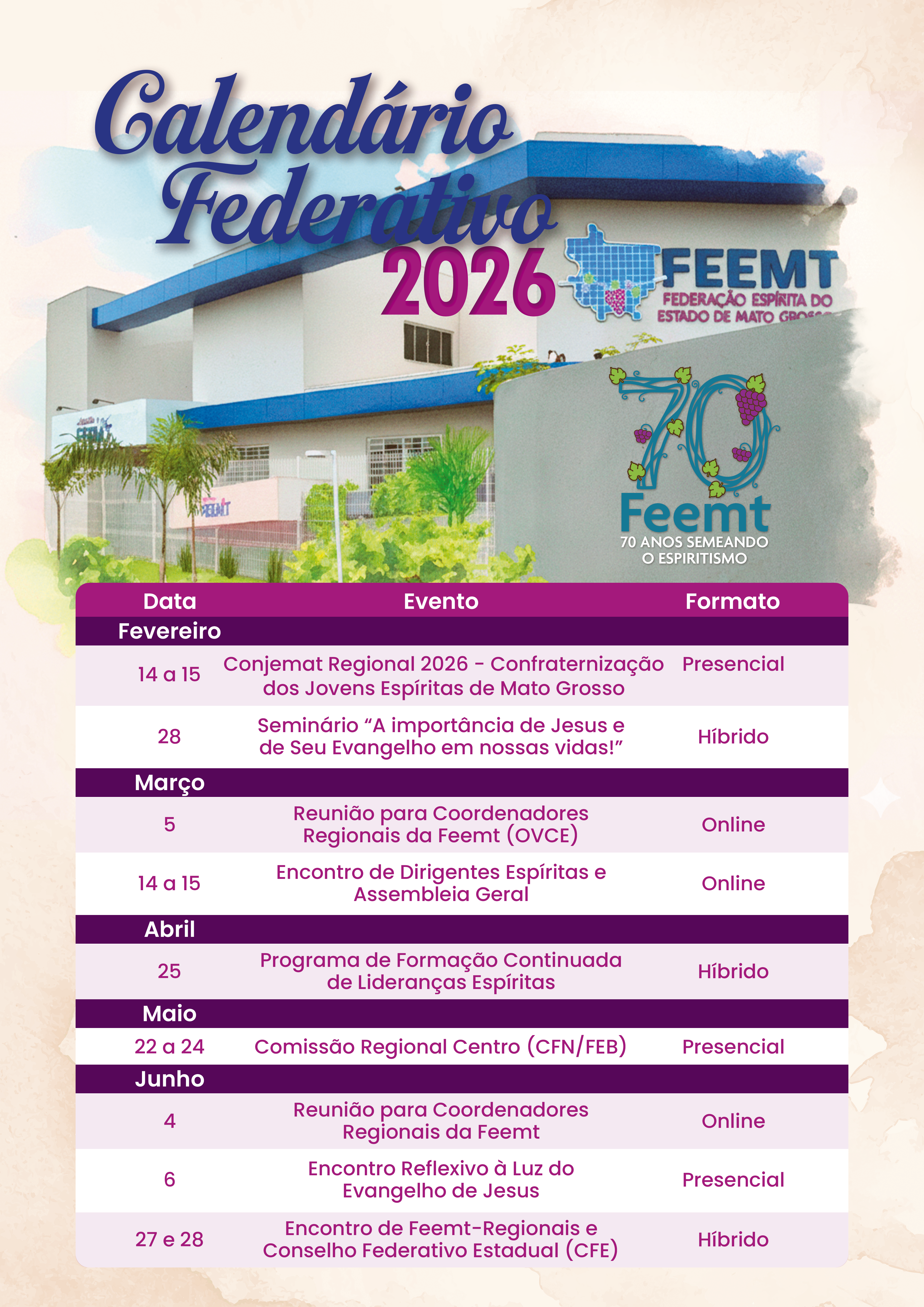 A Federação Espírita do Mato Grosso tem o prazer de apresentar o Calendário Federativo de 2026, um roteiro completo dos eventos promovidos pela Federação, para fortalecer a nossa união, conhecimento e crescimento espiritual ao longo do ano. Encontros, seminários, caravanas e muito mais esperam por você!
